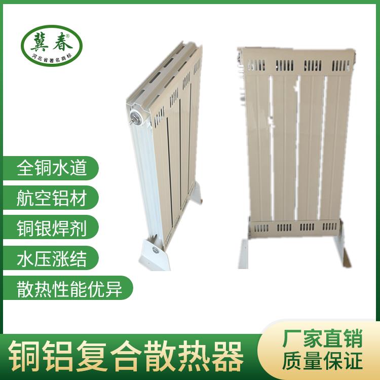 铜铝复合板式采暖散热器是铜管和铝型材的复合材料。铝型材和铜管通过装置的高压膨胀开展膨胀,使其紧密结合。组装并焊接好几根圆柱,然后在两侧组装功能性装饰构件以形成板式散热器。它的外观类似于钢制板式散热器。构造连贯,外观好看,易于洁净,重量轻,压力高,散热效果好(辐射,对流),经久耐用,适用于所有加热系统。